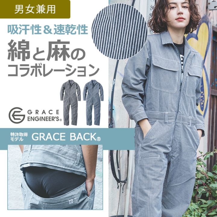 コットンリネンツナギ 長袖 GE-887 春夏対応 綿麻生地 ヒップオープン 長袖つなぎ SS-5L グレースエンジニアーズ