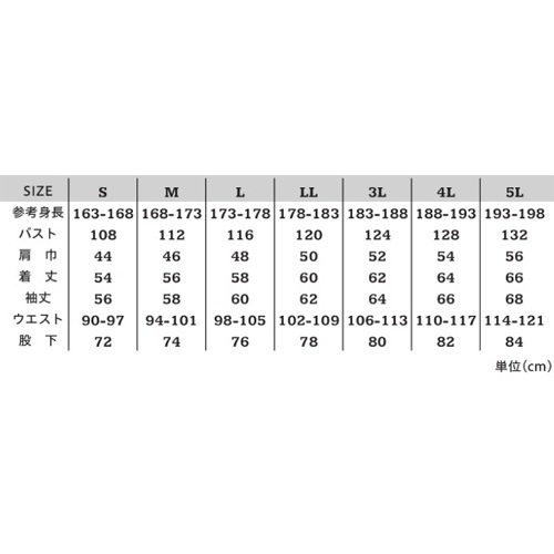 | 機能 | 胸ポケット、袖口マジックテープ、ウエスト調整可能 |