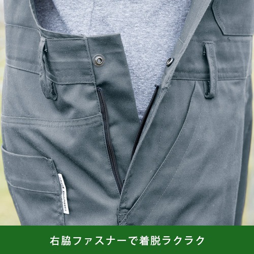 オールシーズン使用可能なポリエステルと綿の混紡生地を使用した、金属が表に出ないサロペットを求めるユーザーの声から企画開発されたプロ仕様。