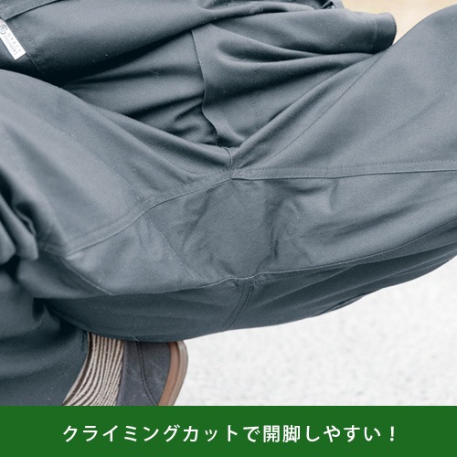 落下防止のファスナー付き胸ポケットや自然な動作で取り出しやすい太腿のポケットと収納性も高く、開脚しやすいクライミングカットに膝3Dカットと至れり尽くせりな仕様。また、あるとないとでは全然違う右脇部の着脱用ファスナーも快適。コーディネート次第でオンオフ使える万能サロペットです。