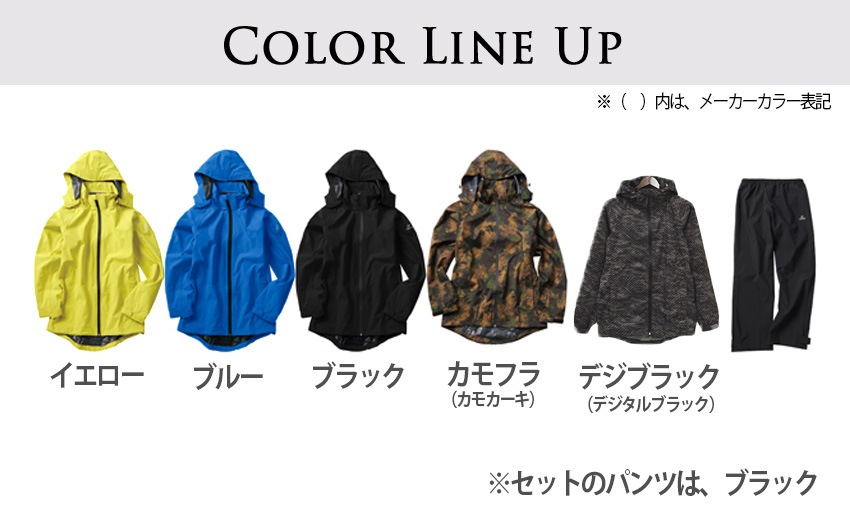 | 機能 | 防水(耐水圧10,000mmH2O) 透湿(透湿度5,000g/m2/24hrs) ストレッチ 防水 撥水 防風 反射プリント(左袖)(パンツ左側) 反射テープ(背) 止水ファスナー フード脱着 収納袋付き 上下セット(パンツはブラックのみ) |