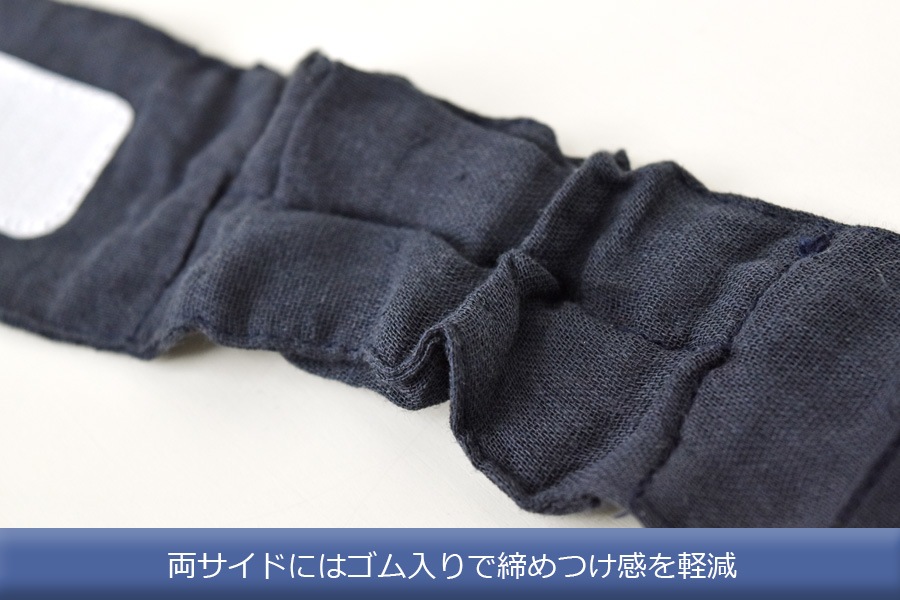 ガーゼ生地はストレッチ性がありませんが、サイドにゴムを入れることでバンドの伸縮性が高まるので快適なつけ心地になります。