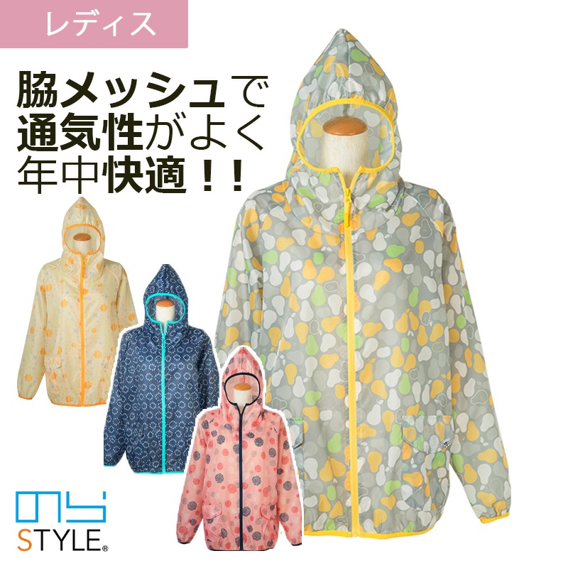 ポップで可愛いプリント柄で、女性にフィットしたフルジップヤッケ。軽くて風を通しにくい高密度ポリエステルを使用。軽撥水加工で、少々の水や霧雨・泥汚れにと活躍します。