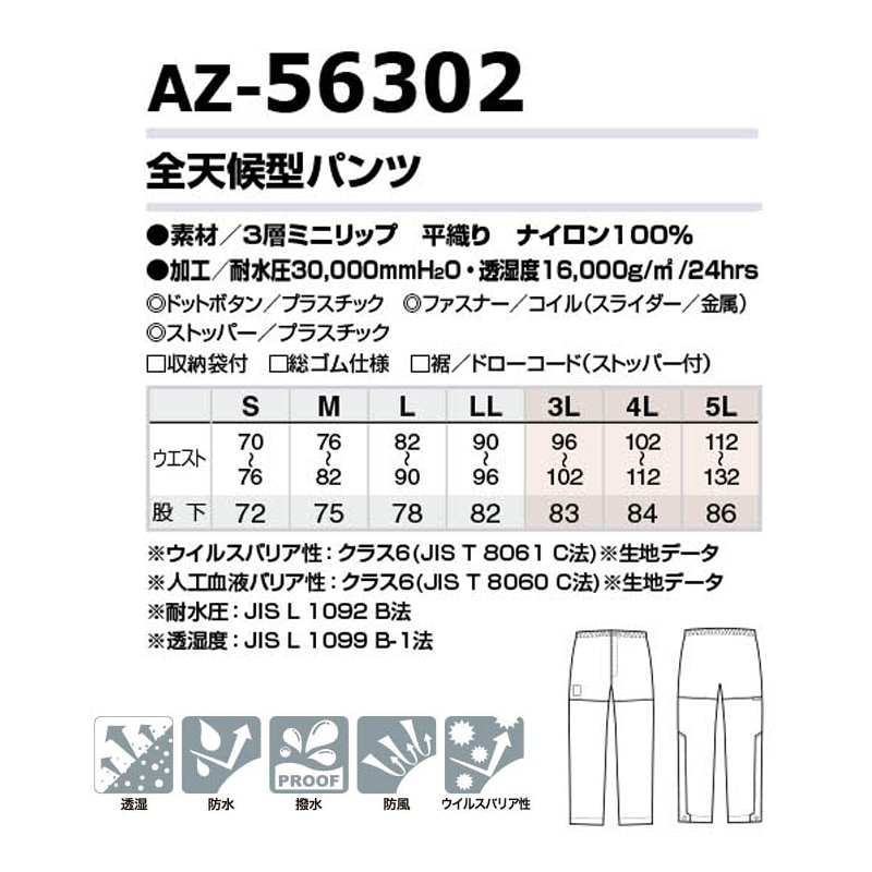 全天候型パンツ AZ56302 レインウェア 雨具 防水 防風 撥水 透湿 ウイルスバリア性 S-5L DiAPLEX