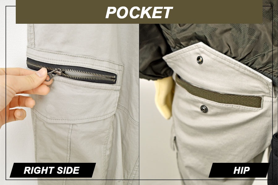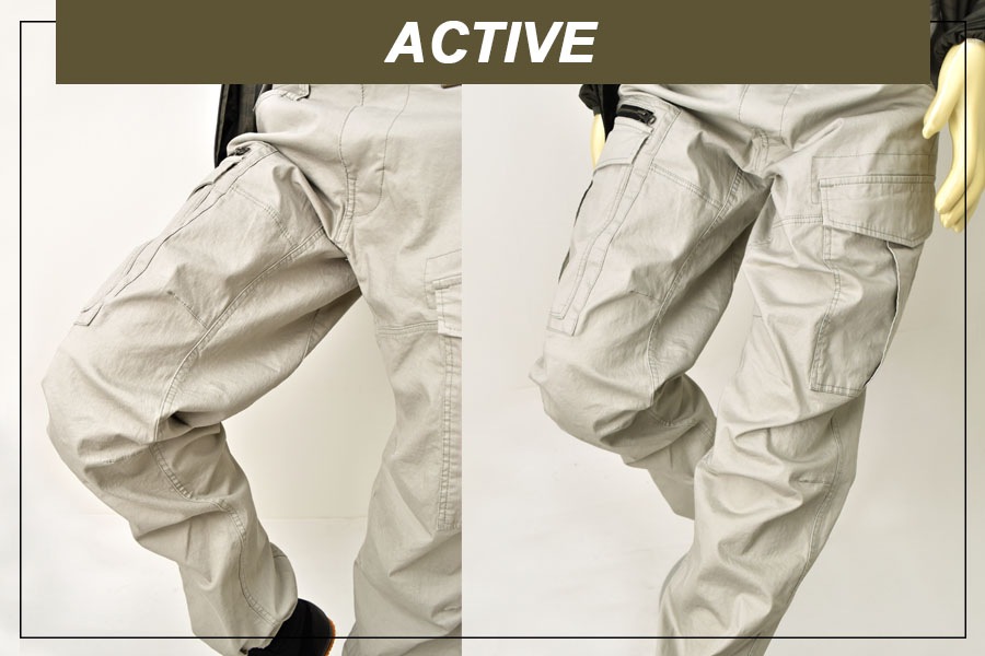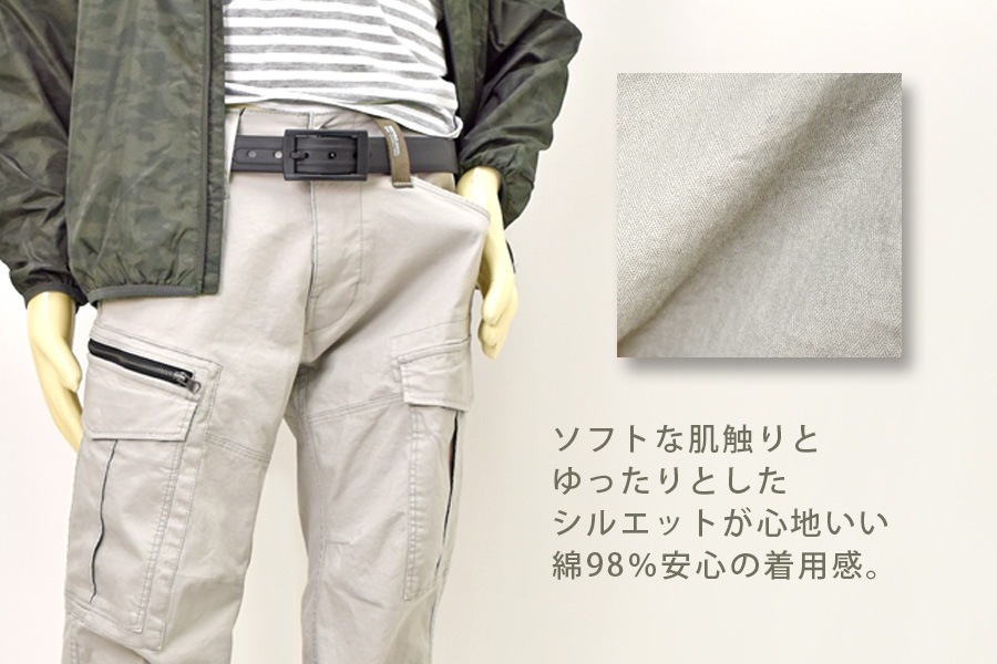 ヒザの立体裁断とストレッチ素材で動きやすさを追求しました。裾は半リブになっていて長靴やハイカットシューズとの相性抜群です。ゆったりシルエットなので窮屈さはありません。ウォッシュド加工を施したソフトな肌触りのカジュアルテスト。カーゴポケットや素材違いのベルト通しなど遊び心あるカジュアルなデザインです。