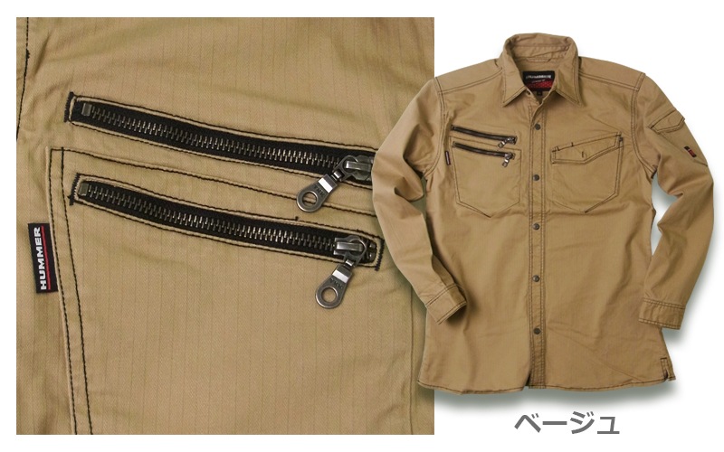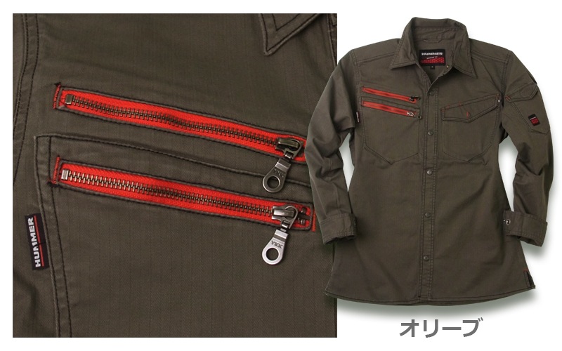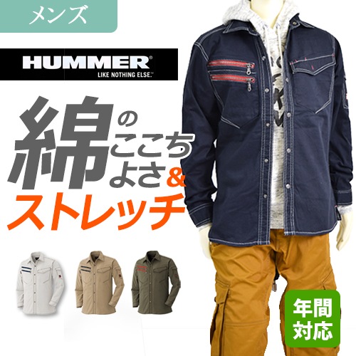 作業用長袖シャツ。定番化しがちな作業服をカッコよくデザインした、機動性・パワー・耐久性の象徴HUMMERブランドの農作業服です。ストレッチが効いていてハードな作業時でもラクラク快適!