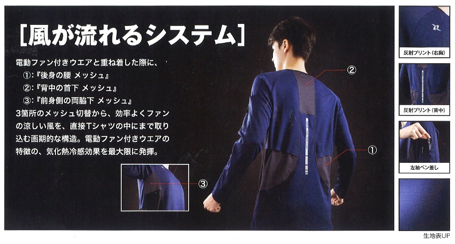 電動ファン付きウェアと重ね着した際に、後身のメッシュ、背中の首下メッシュ、前身側の両脇下メッシュの3か所のメッシュ切替から、効率よくファンの涼しい風を、直接Tシャツの中にまで取り込む画期的な構造。電動ファン付きウェアの特徴の、気化熱冷感効果を最大限に発揮。