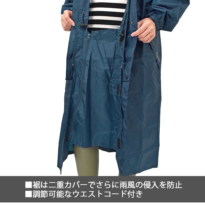 ロング丈プラス、足元は二重構造で雨の侵入を防ぎます。