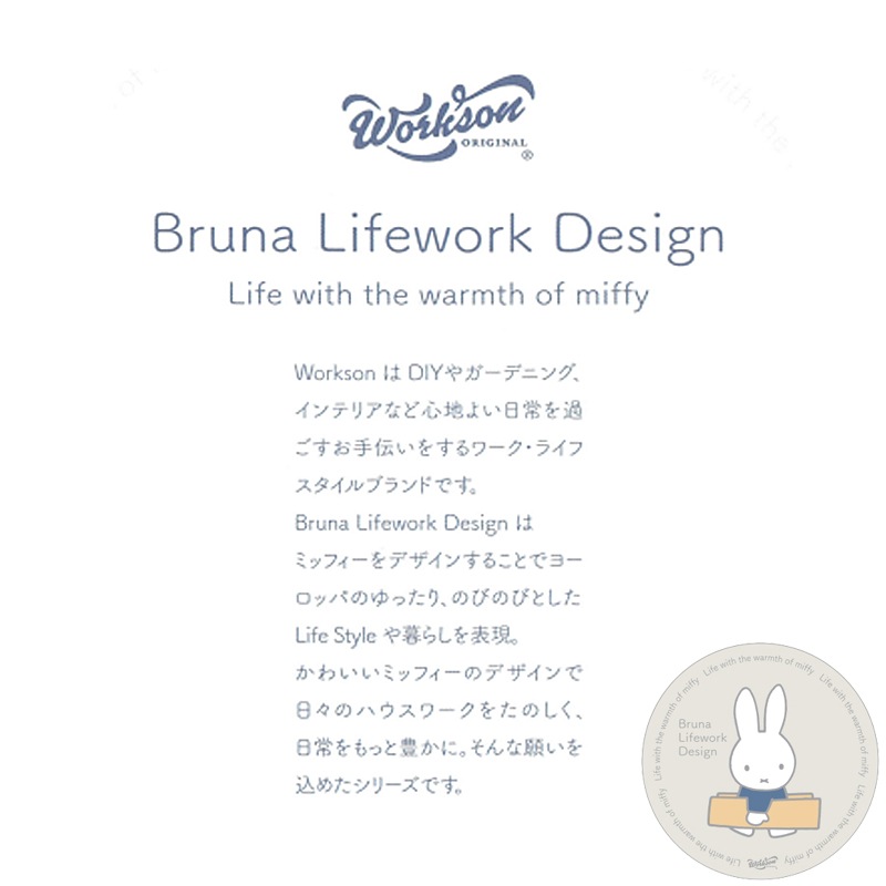 WorksonはDIYやガーデニング、インテリアなど心地よい日常を過ごすお手伝いをするワーク・ライフスタイルブランドです。Bruna Lifework Designはミッフィーをデザインすることでヨーロッパのゆったり、のびのびとしたLife Styleや暮らしを表現。かわいいミッフィーのデザインで日々のハウスワークをたのしく、日常をもっと豊かに。そんな願いを込めたシリーズです。