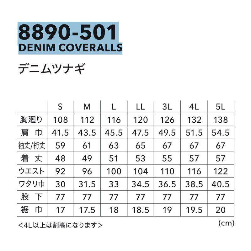 デニムツナギ 8890-501 秋冬 ストレッチ 長袖 ストレッチ 作業着 作業服 S-5L TORA 寅壱