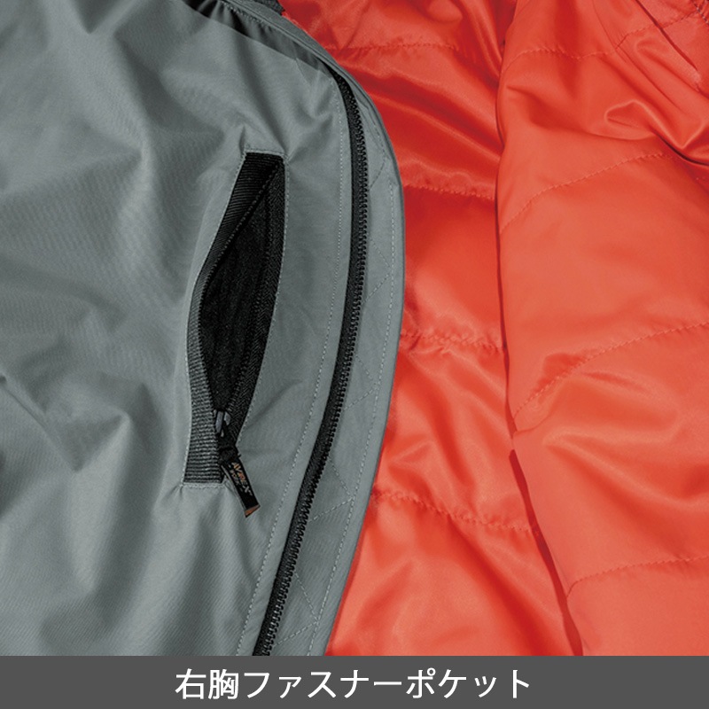 | 特徴 | 防寒、防風、一時撥水機能、大型ファスナーポケット、視認性を高めるオレンジ色の裏地、左肩反射プリント、左袖多機能ポケット、右袖ワッペン、両脇フラップポケット、右胸ファスナー、左袖ロゴプリント |