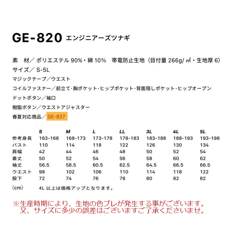 ※同じデザインでGE827 春夏対応ツナギ、別ページにございます。