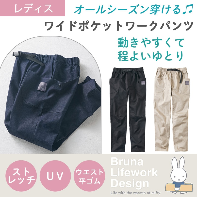 miffy ワイドポケットワークパンツ 95509 秋冬 ミッフィー オールシーズン ストレッチ UVカット ウエスト平ゴム バックル 多ポケット ヒザ立体裁断 M-3L Bruna Lifework Design workson