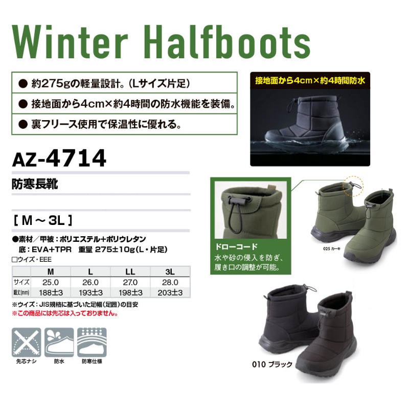 防寒長靴 AZ4714 秋冬 保温 防寒靴 約275gの軽量設計 防水機能 M25.0-3L28.0 アイトス