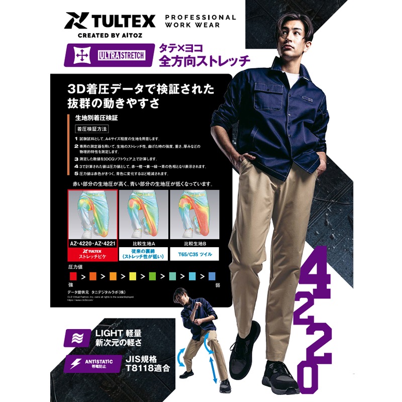 ワークパンツ ノータック AZ4220 秋冬 全方向ストレッチ 軽量 帯電防止 JIST8118適合 3S-6L タルテックス TULTEX