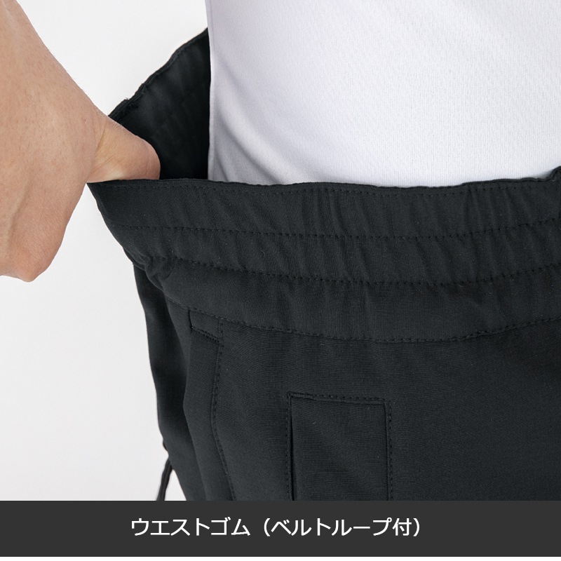 〇ウエスト総ゴム仕様で動きやすく快適フィット、ベルトループ付き。