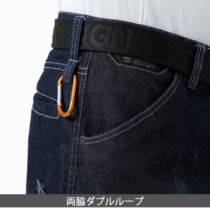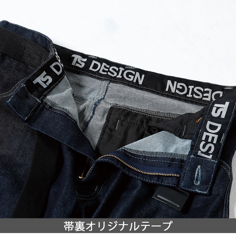 両サイドのカーゴポケットはファスナーポケットと物を素早く出し入れ出来るクイックアクセスポケットを採用。ベルトループの両脇はダブルループ仕様になっており、カラビナ等を引っ掛けることができる。帯裏オリジナルテープ付き。コインポケット、左カーゴポケットにはTS DESIGNの刺繍入り。ボタン、ファスナーは金属製。