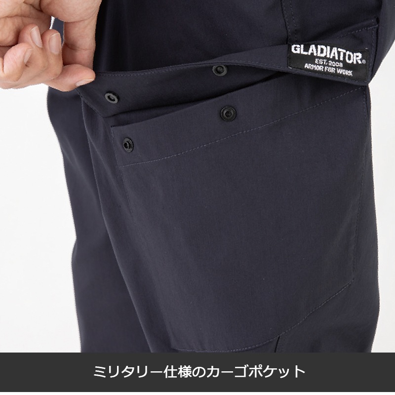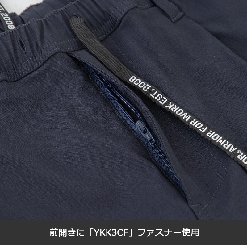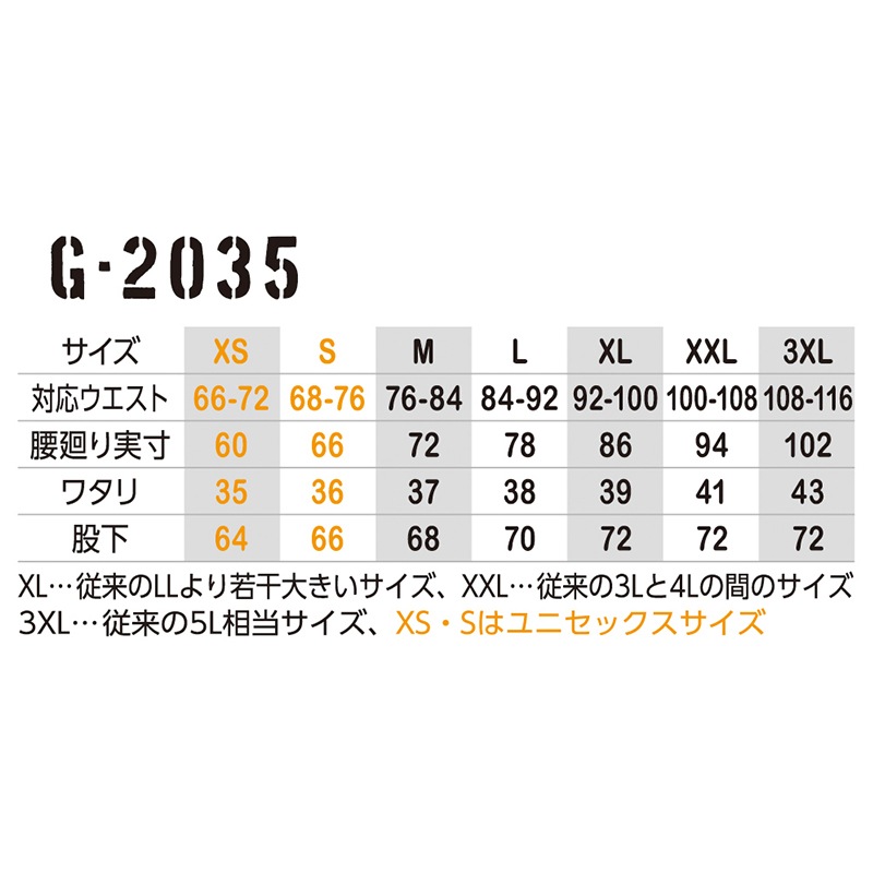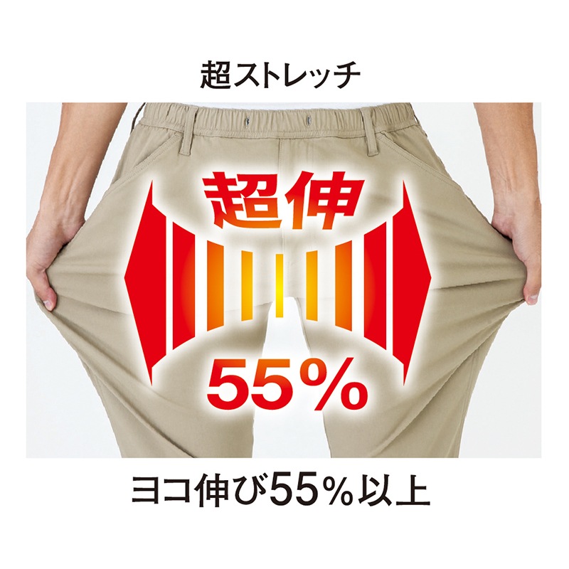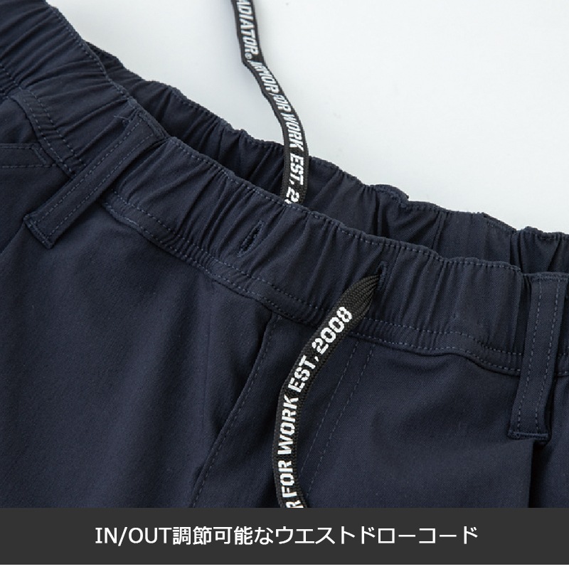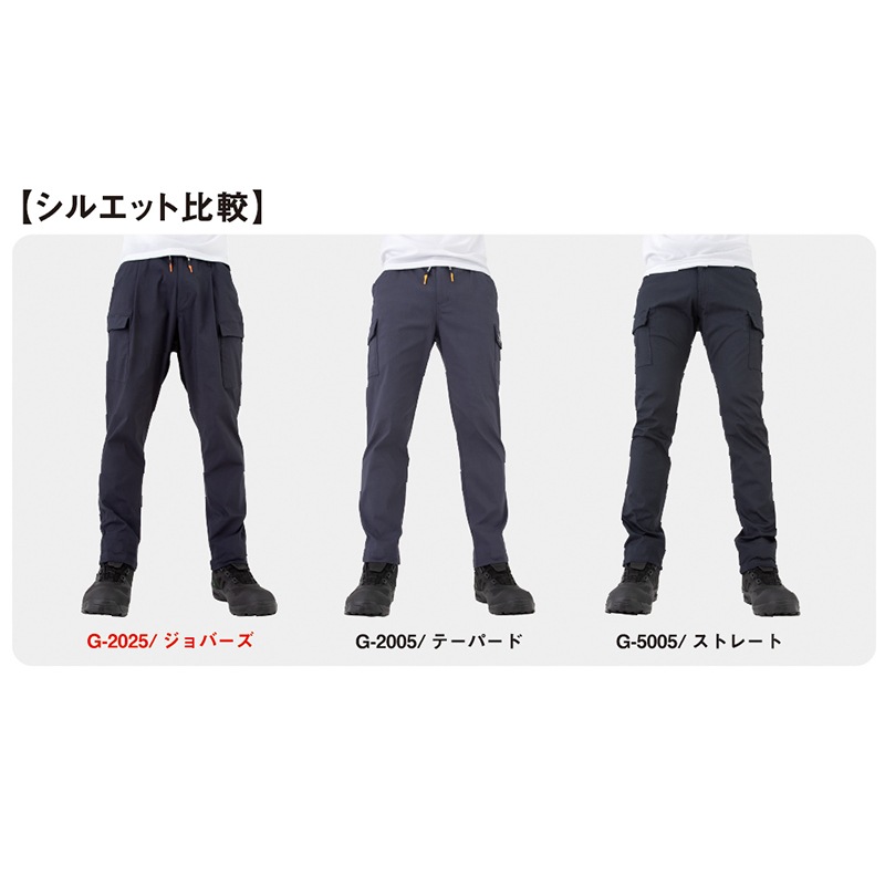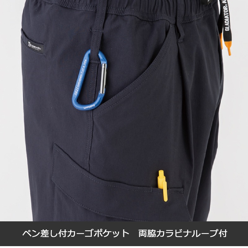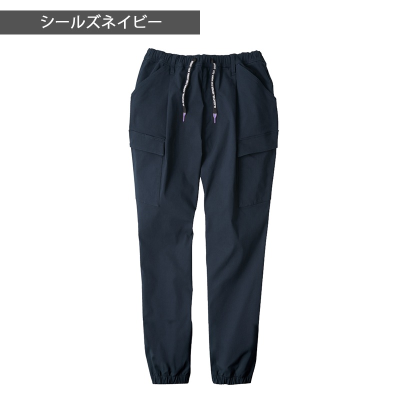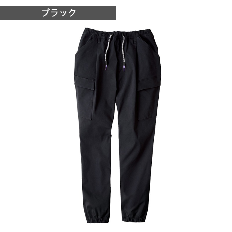 | 機能 | ストレッチ、ウエストゴム&紐、ペン差しポケット、両脇カラビナループ付、前開き、カーゴポケット、裾ジョガータイプ |