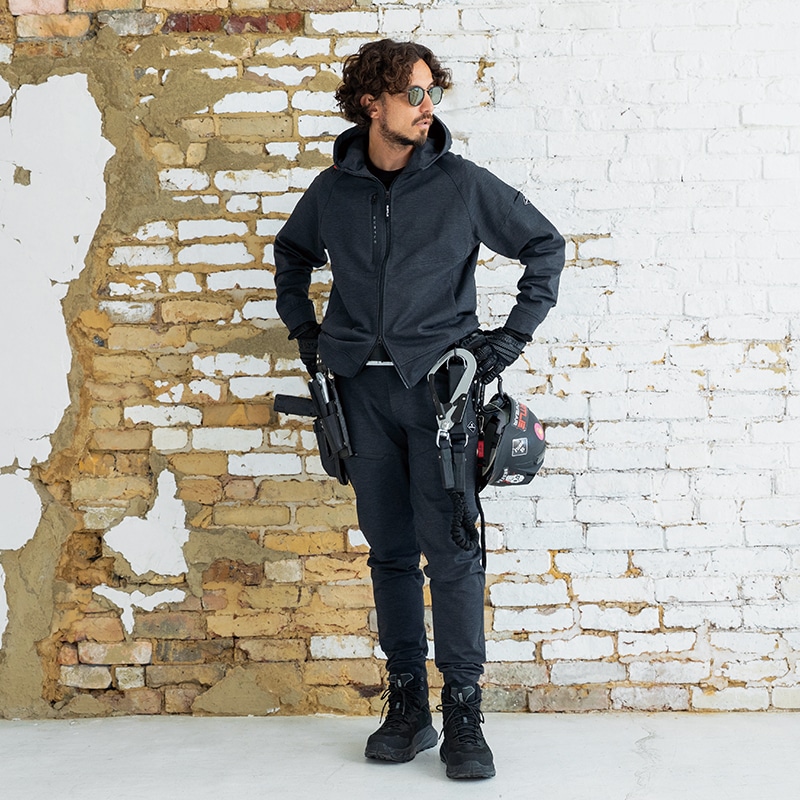 タフなワークシーンにフィットする高強度なコーデュラニットを使用し、スポーツのユーティリティ性を追求したテックウェア