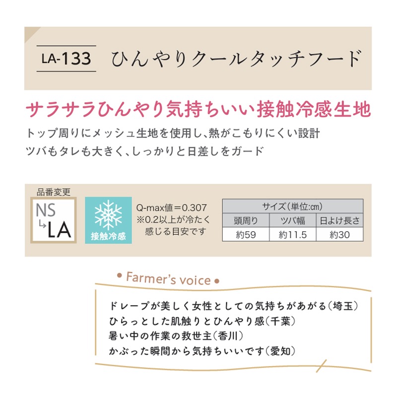 ひんやりクールタッチフード LA133 春夏 接触冷感 熱中症対策 農園帽 頭周り約59センチ ラシク LACQ