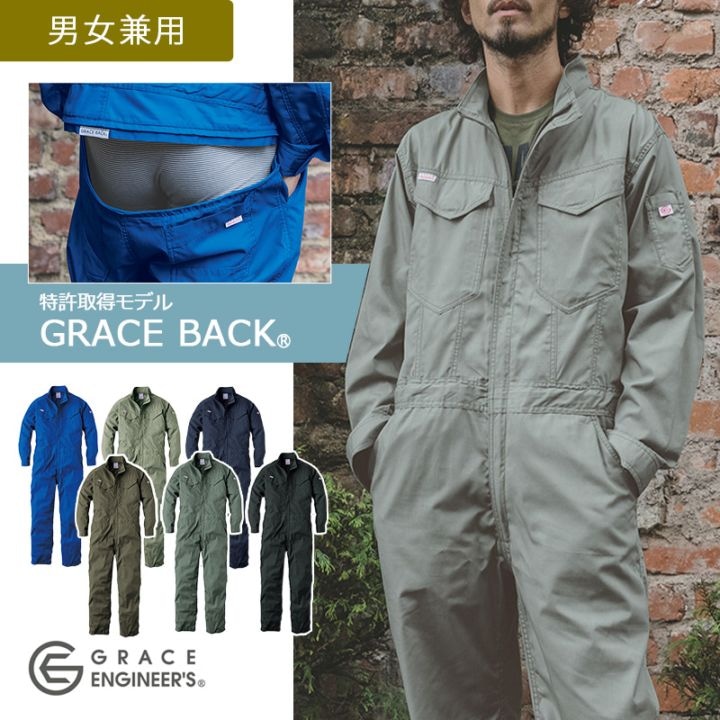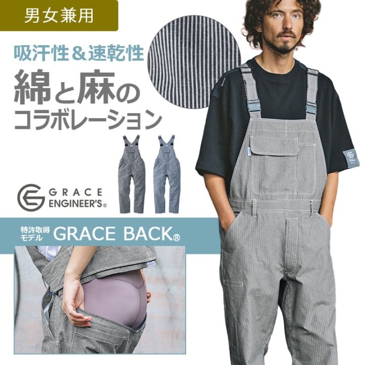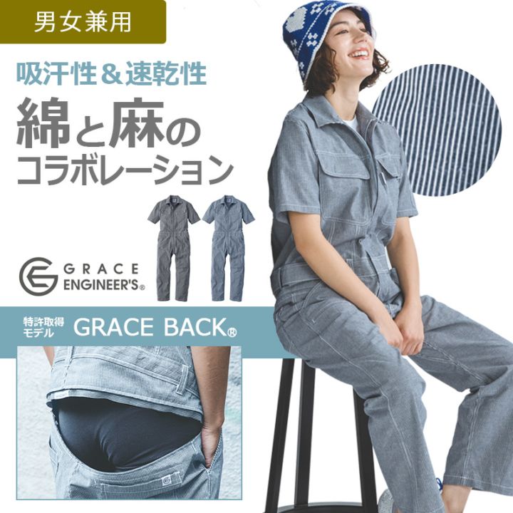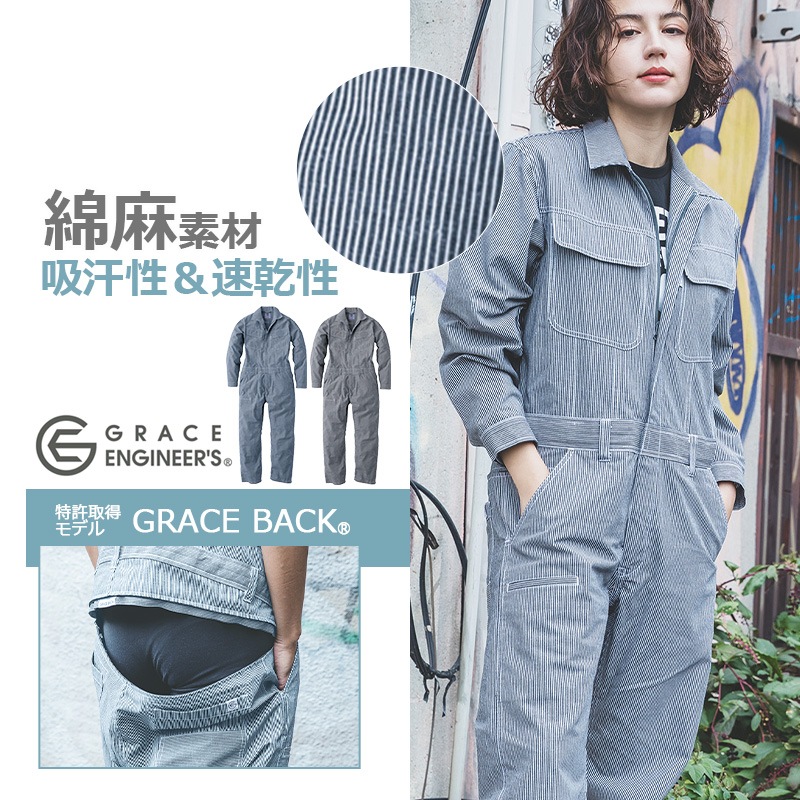 コットンリネンツナギ 長袖 GE-887 春夏対応 綿麻生地 ヒップオープン 長袖つなぎ SS-5L グレースエンジニアーズ