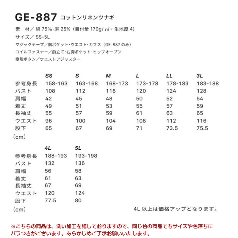 春夏シーズンに最適な長袖つなぎGE887は、通気性の良いコットンリネン(綿麻)素材を使用した快適な作業服。